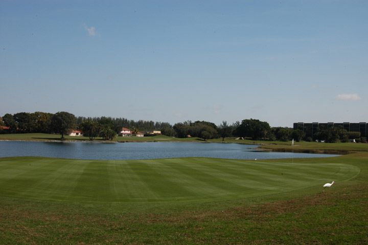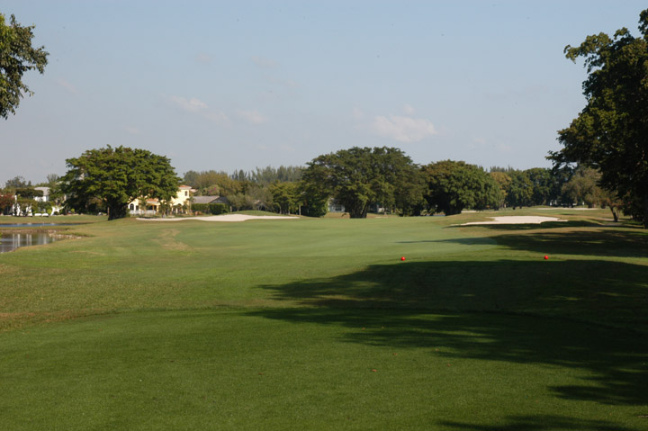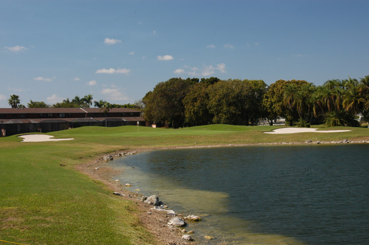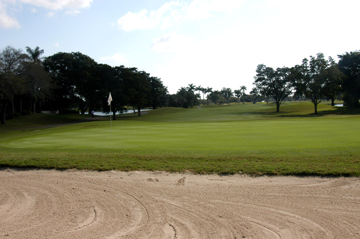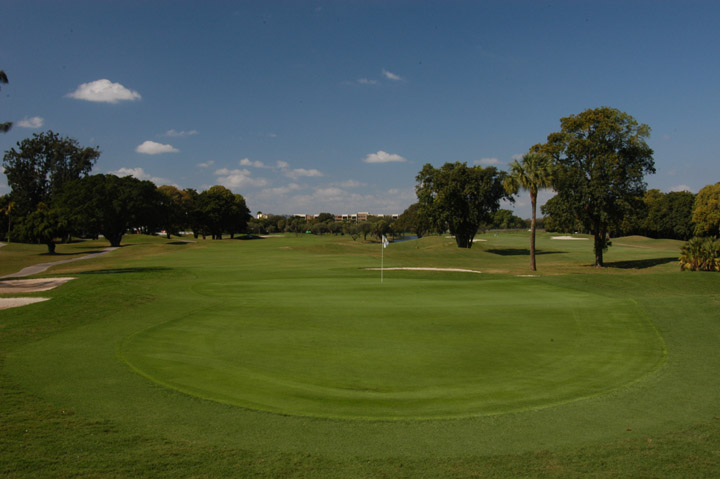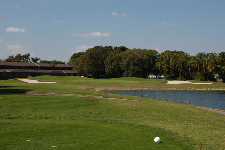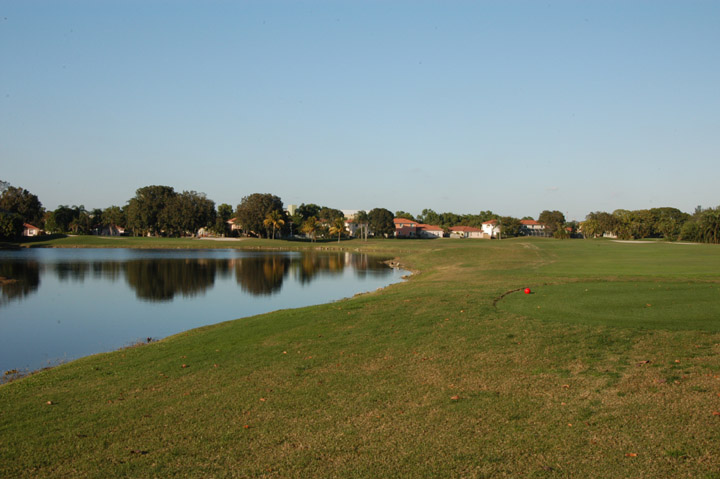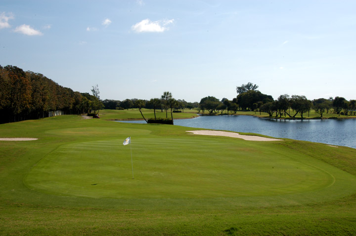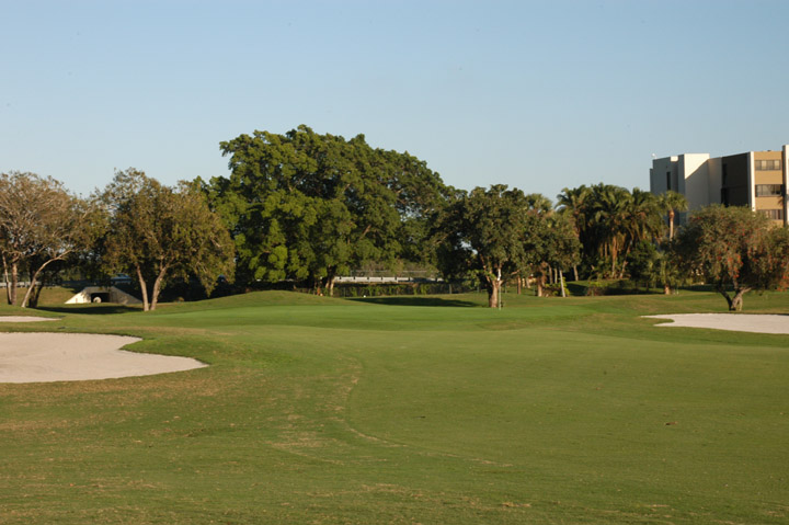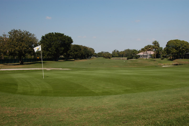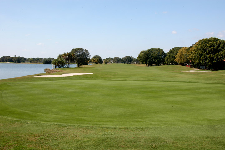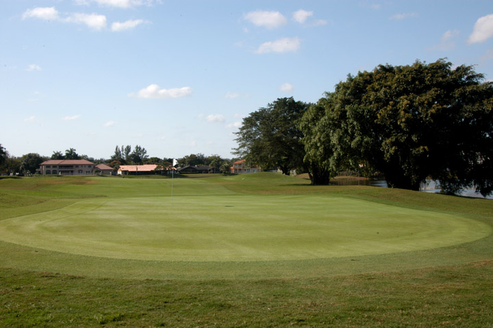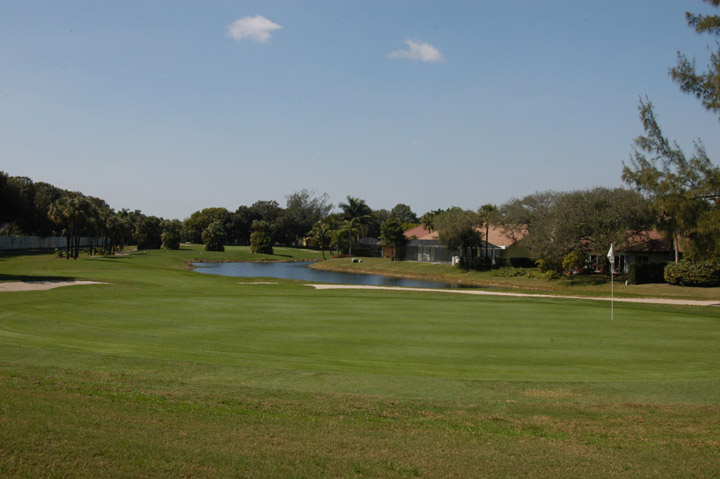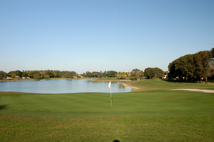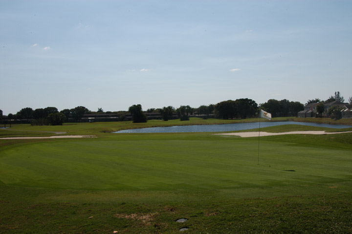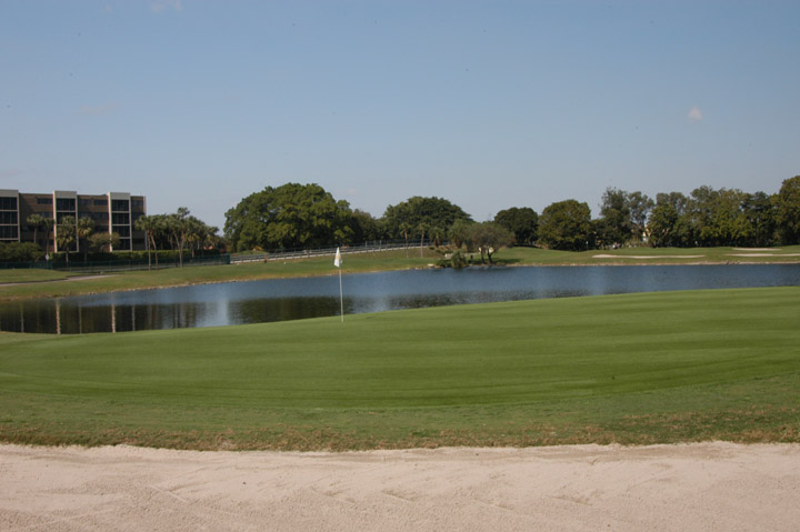 and water cuts off fairway. Island green. 31yd deep green. Ridge across at 65% depth slopes