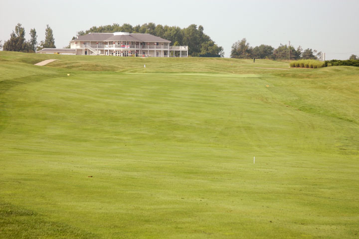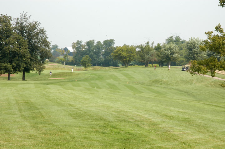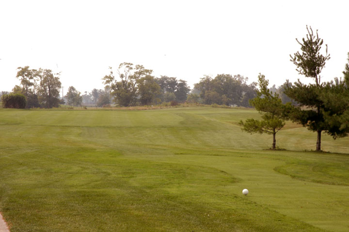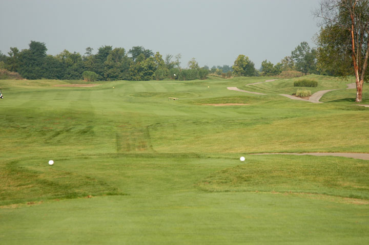 Inclining fairway. Misses right have little threat other than light rough. Grass mounds cutting