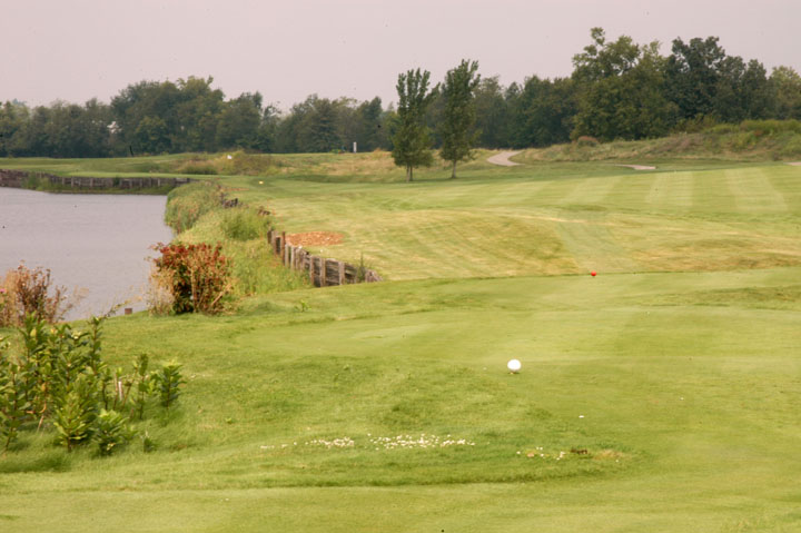 Fairway bends right at 142yd from CG. Anything right drops down the bank to numerous bunkers.