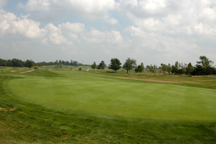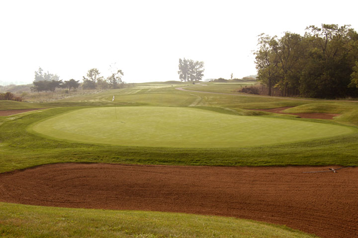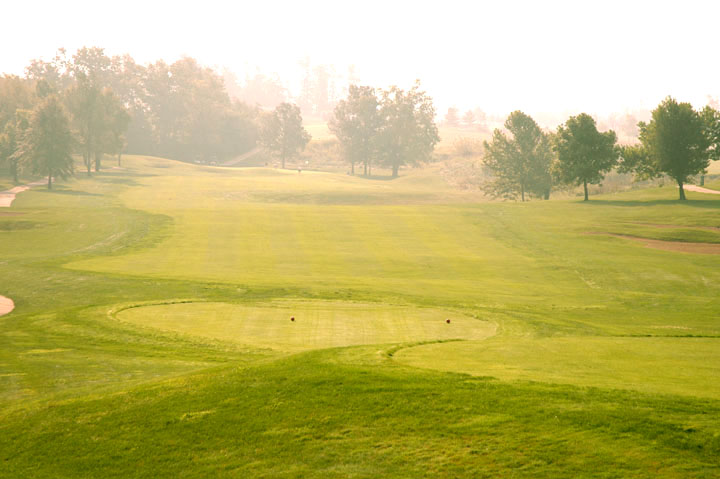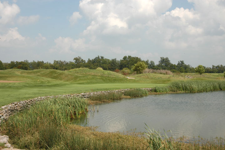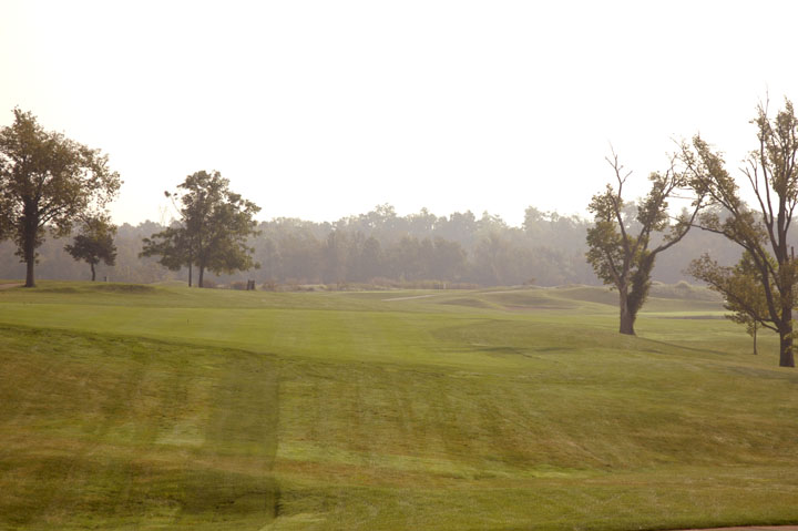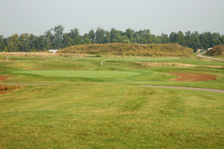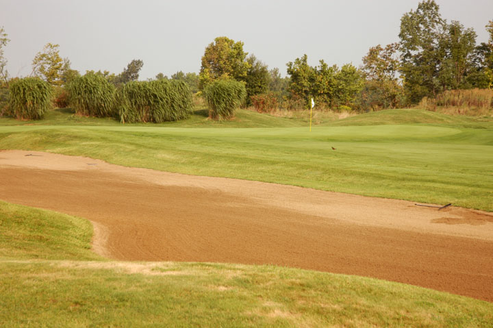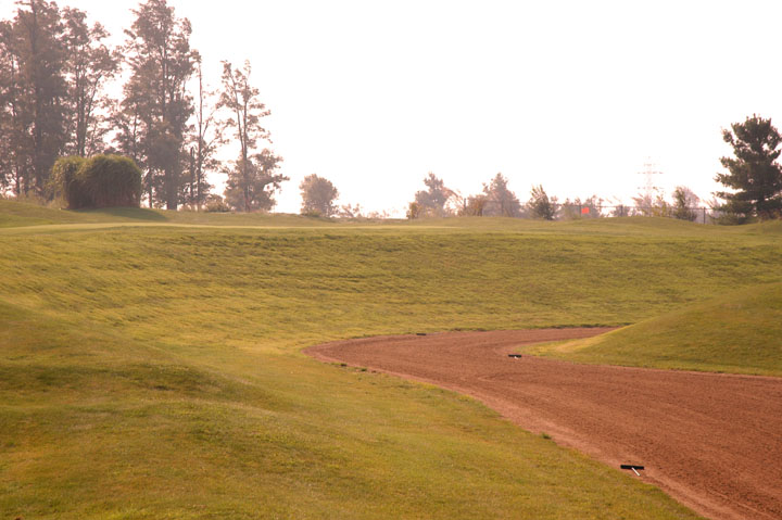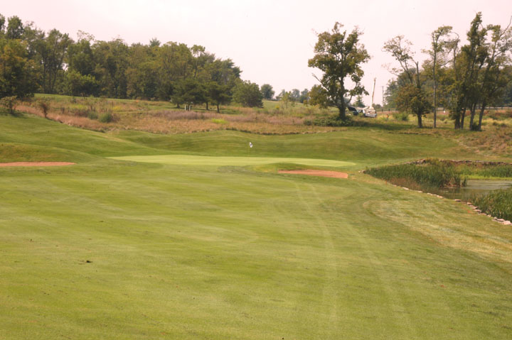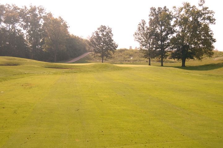 Approach to a39yd deep green. Mounds on the left edges at 25% and 95% depths release right or