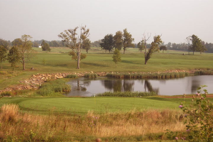 bends right at 60yd from CG. Approach to a 34yd deep green angled right. Front 5% slopes to the