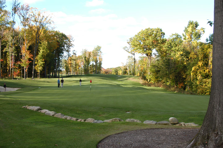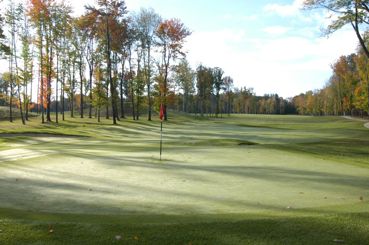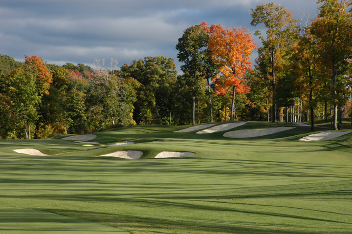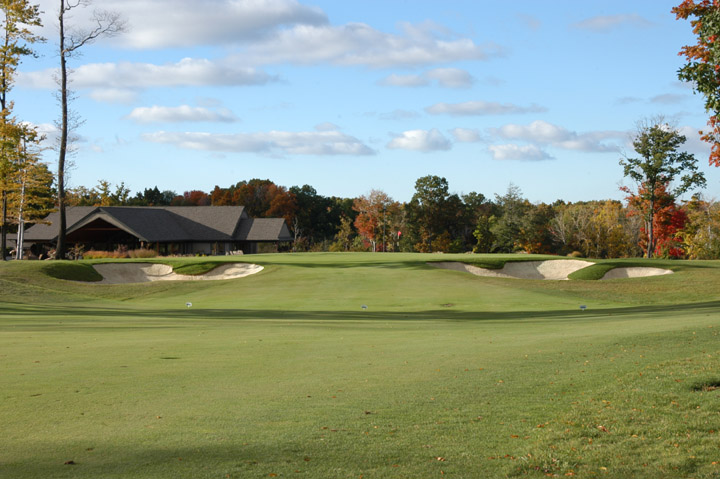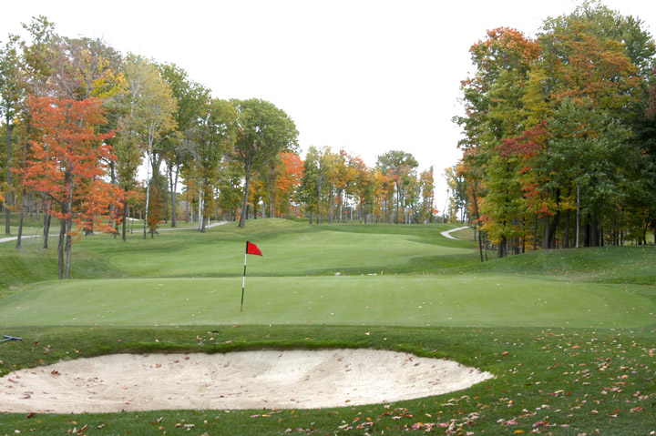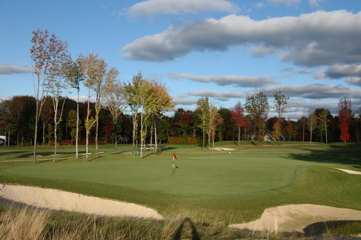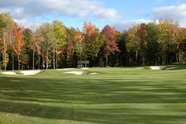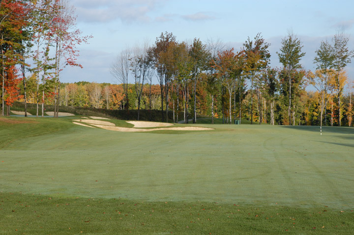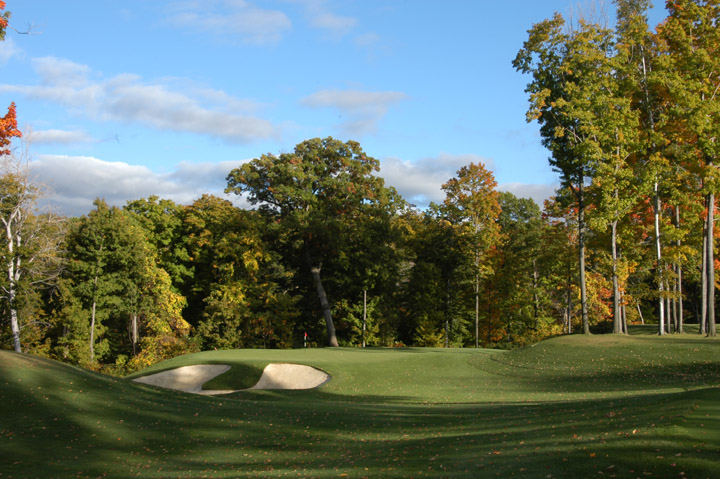 right by bunker and left by a wooded cliff. Front 35% slopes gently to the front right. Ridge
