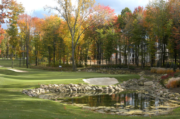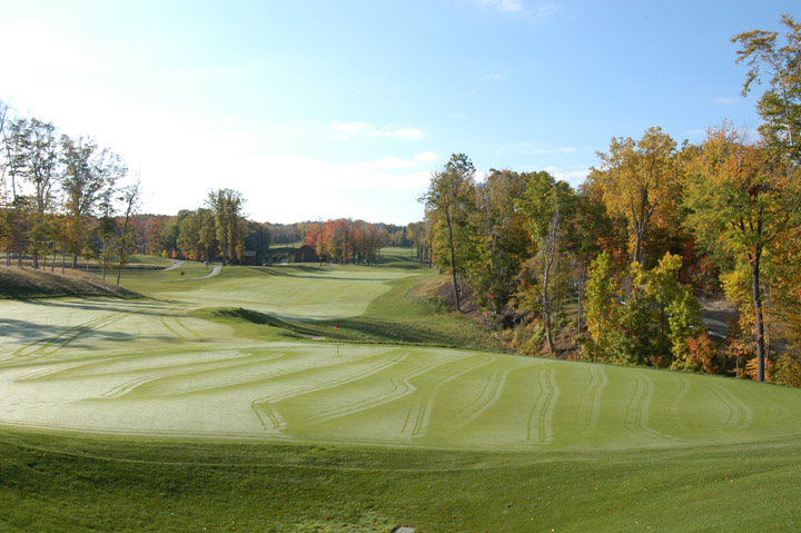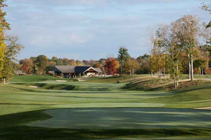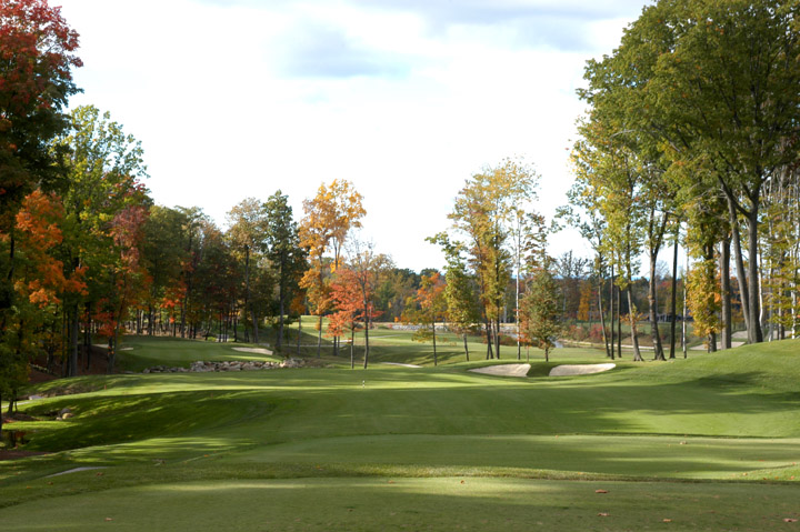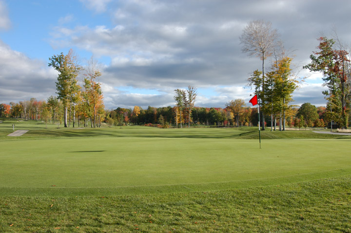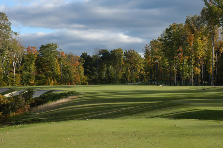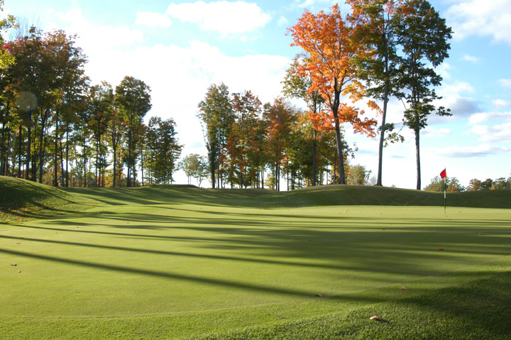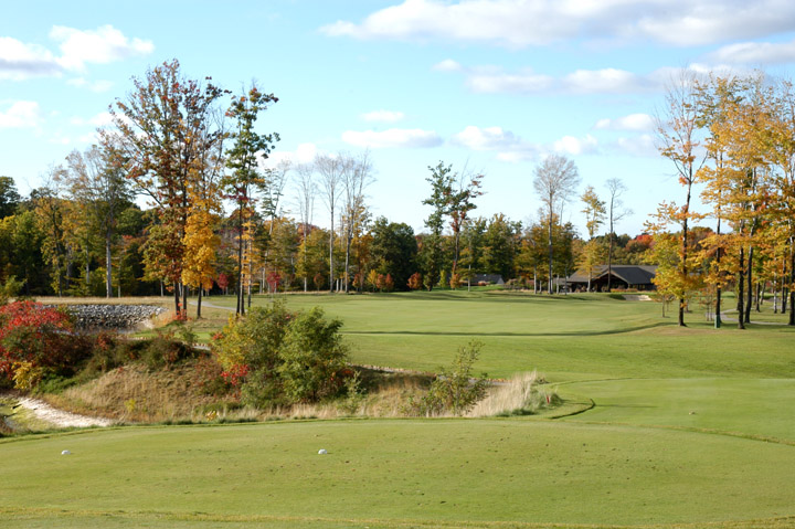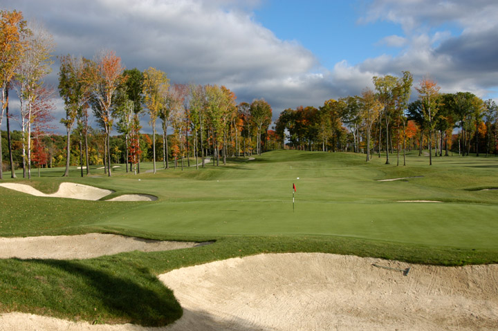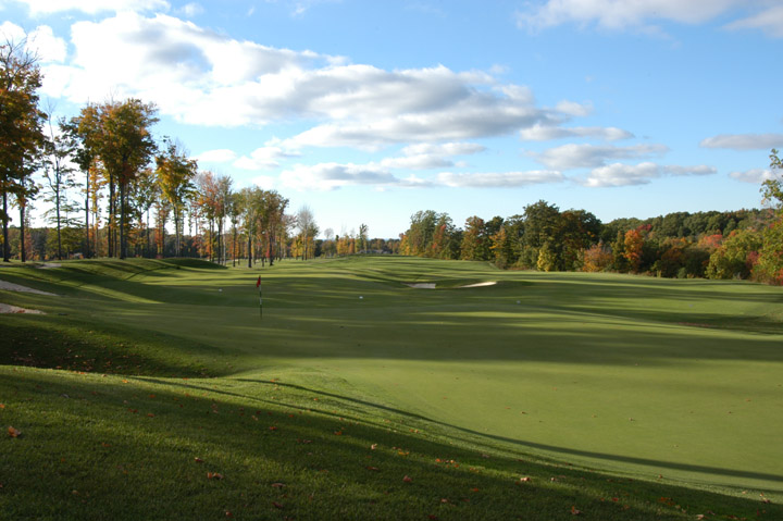 right by bunker and left by a wooded cliff. Front 35% slopes gently to the front right. Ridge