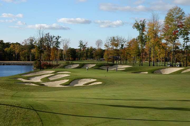 unrecoverable hazard. Approach to a 46yd deep green angled left. Front 10% is false green. Front