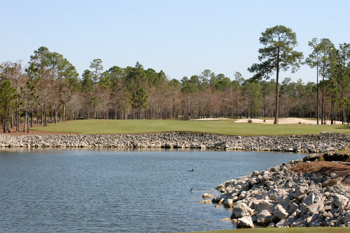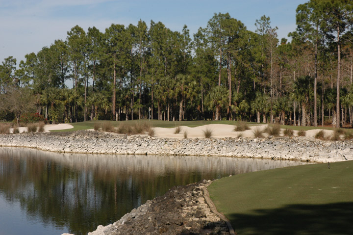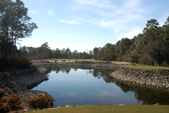 begins at 210yd CG. Fairway curls left around water on the second shot. Bunker begins at 82yd