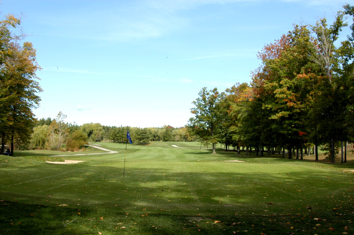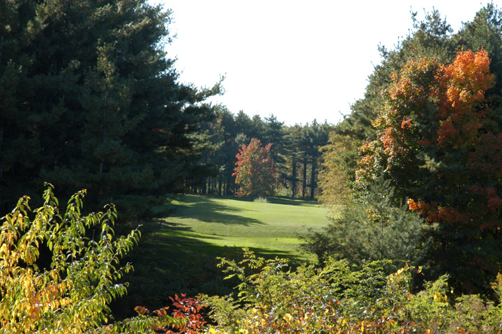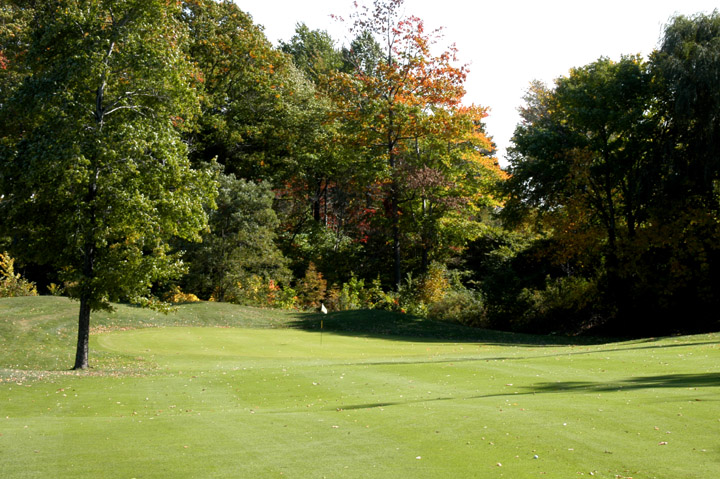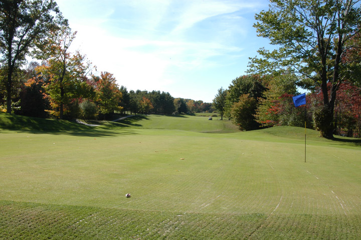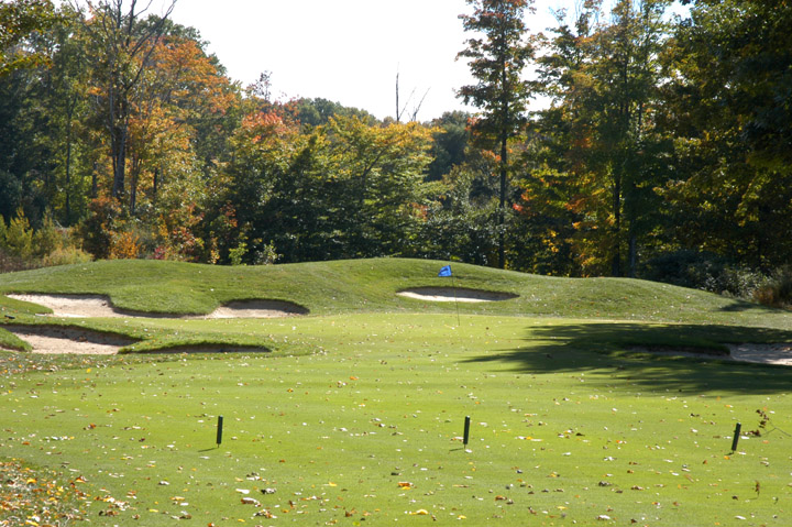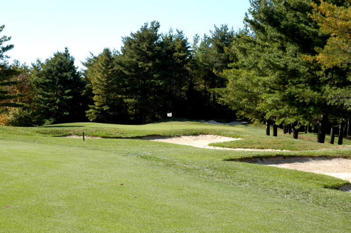 cuts off fairway 65yd shy of the green. Approach to a 29yd deep green. Mound on left side at 30%