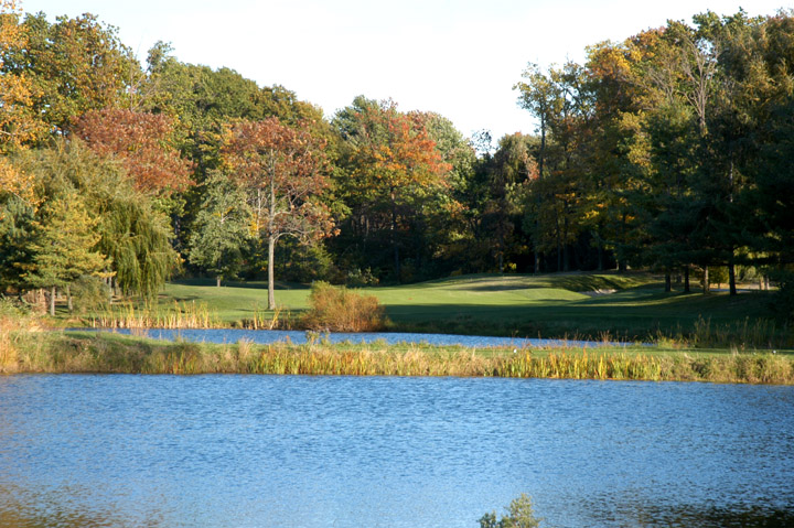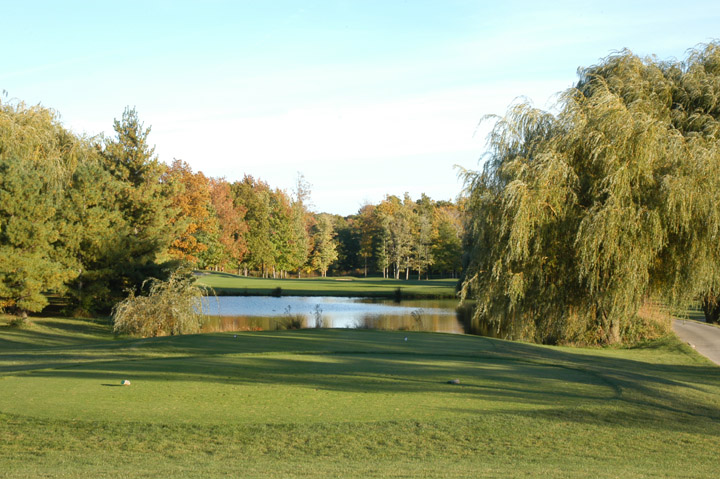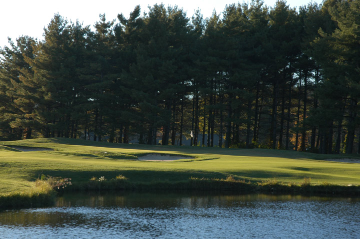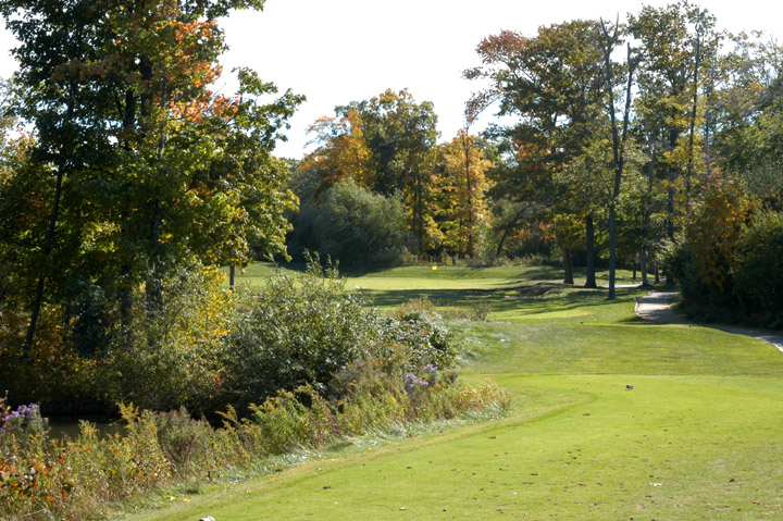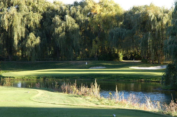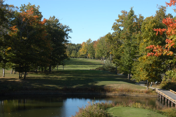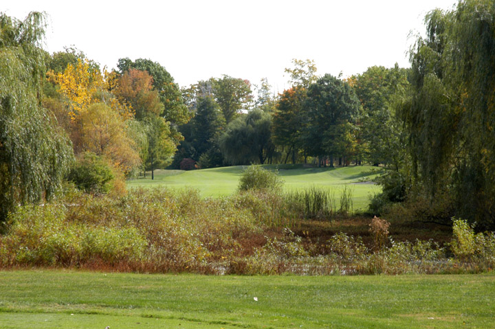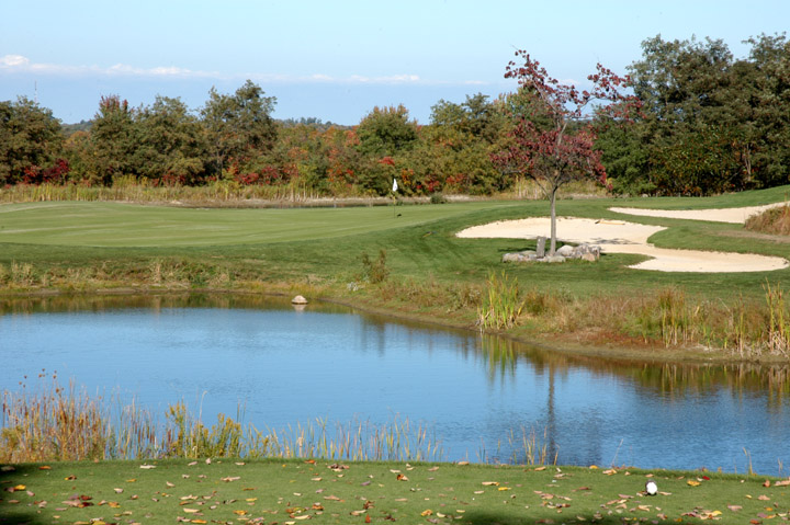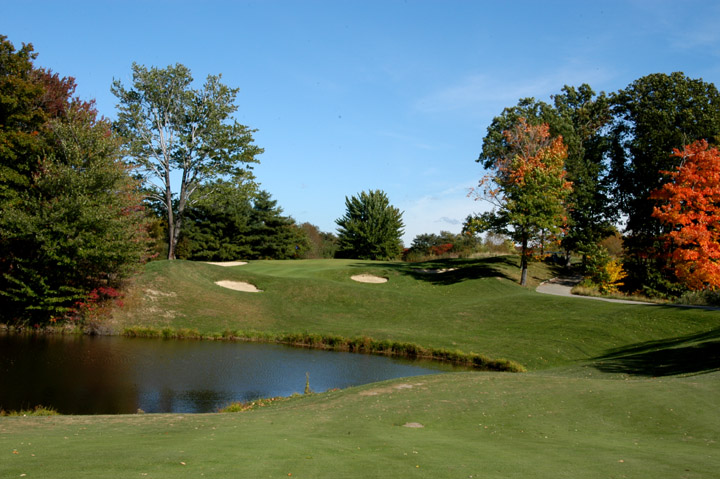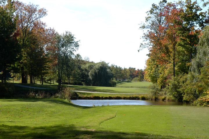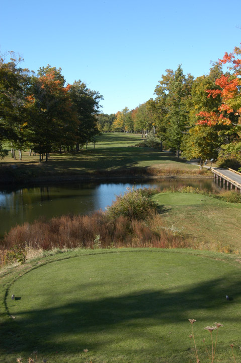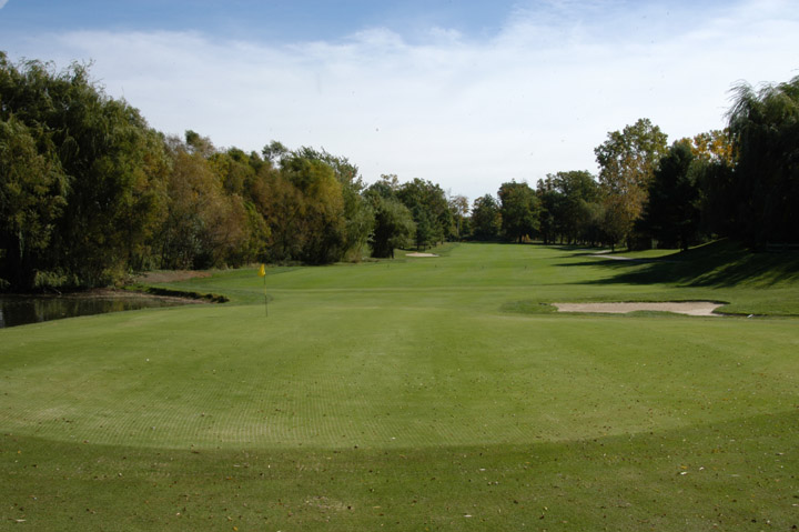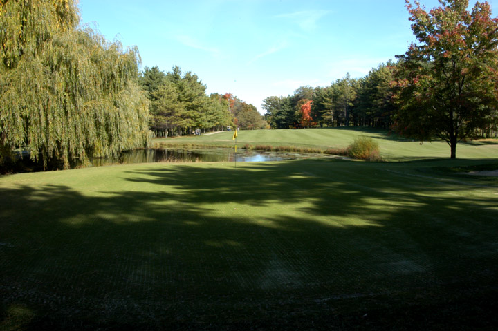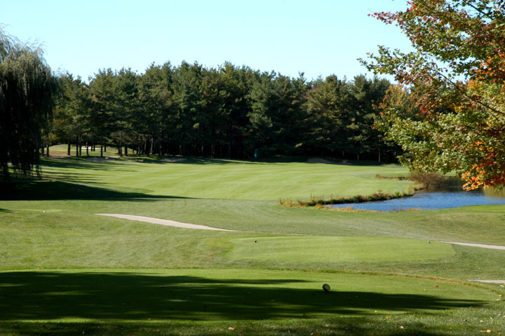 to end of fairway at 70yd CG. Approach downhill, over pond to a 20yd deep green. Back 50% on the