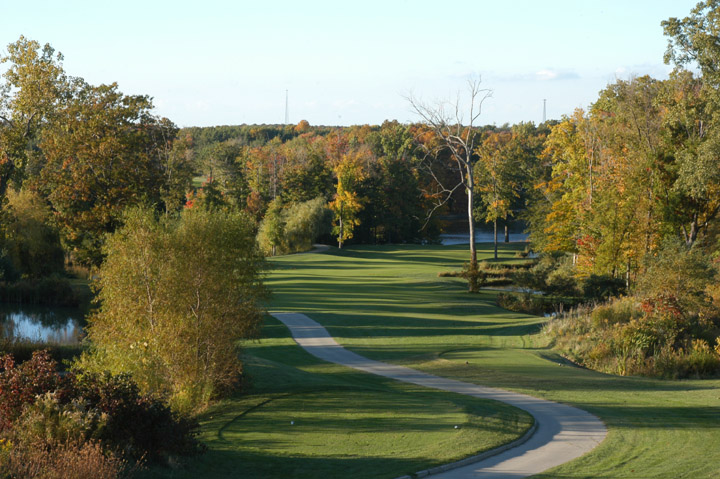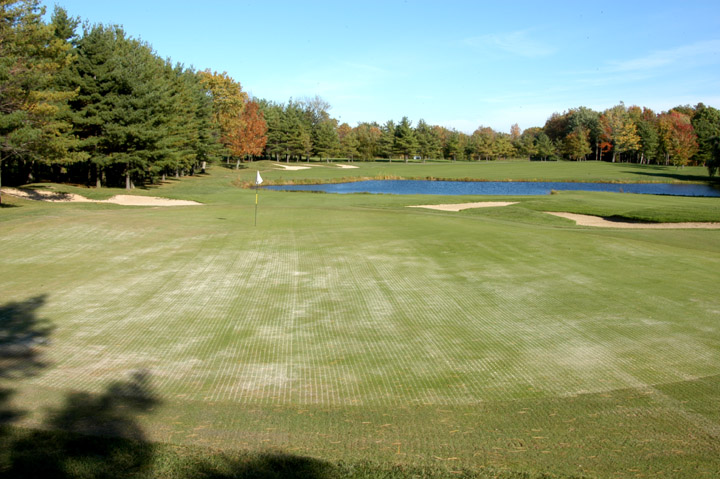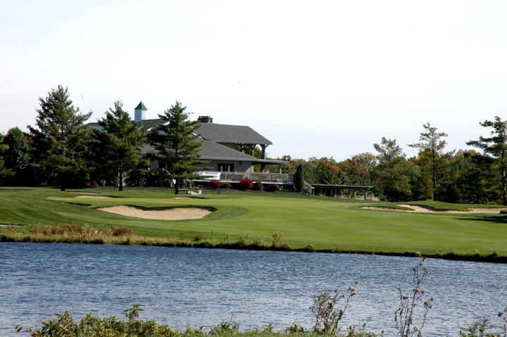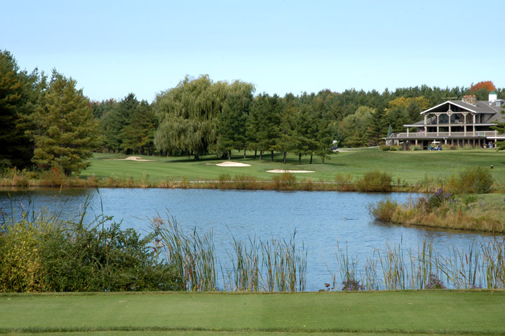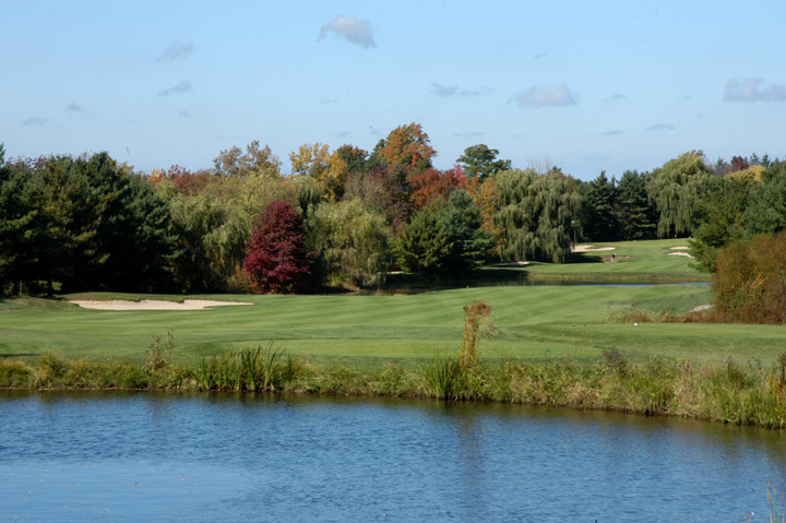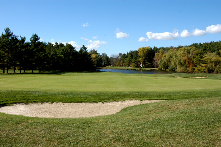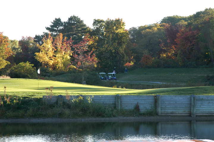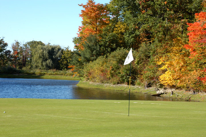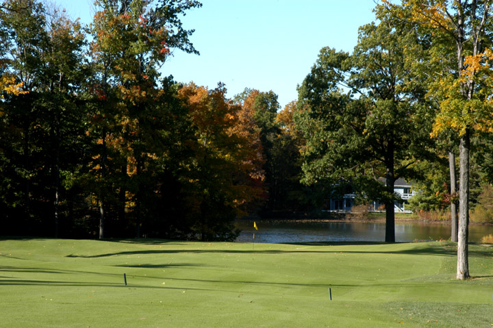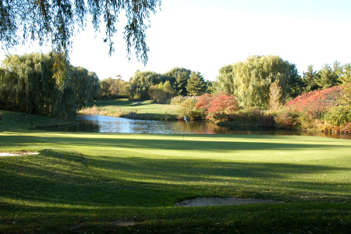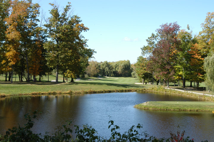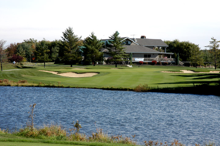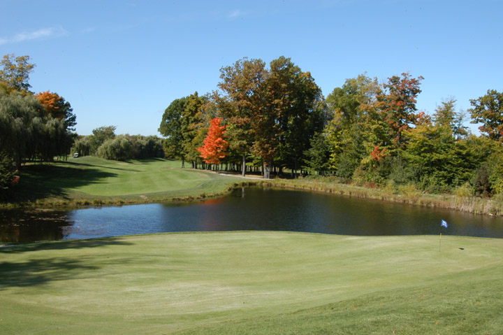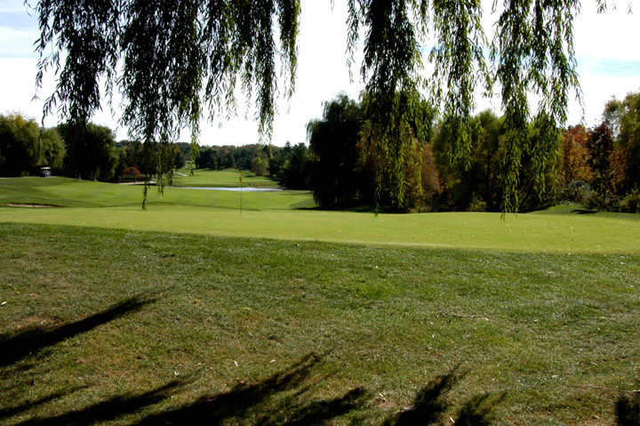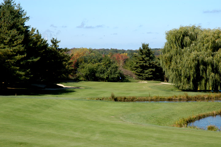 to end of fairway at 70yd CG. Approach downhill, over pond to a 20yd deep green. Back 50% on the