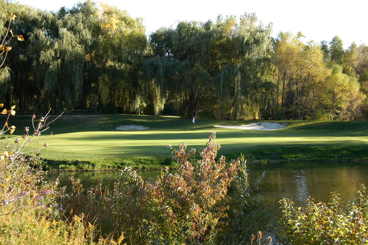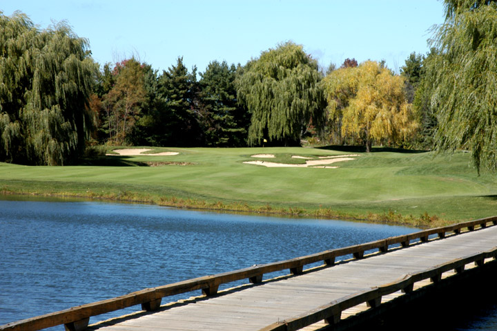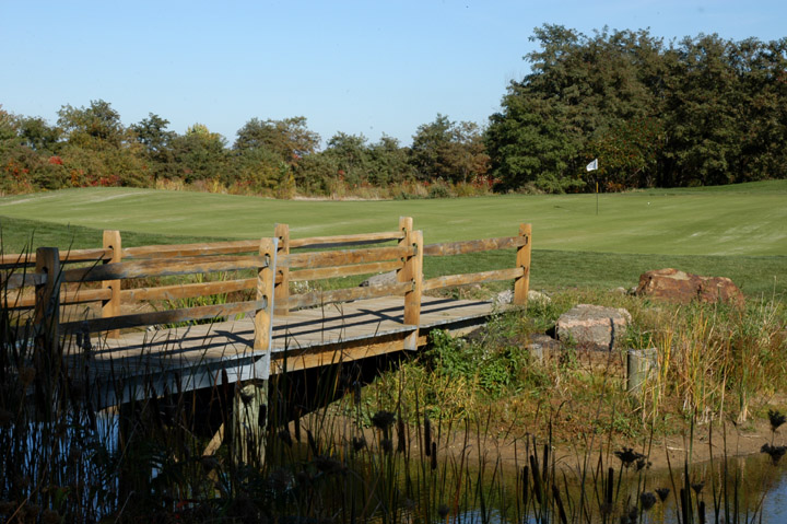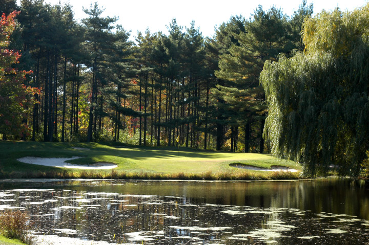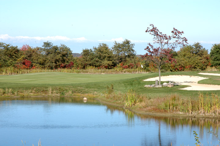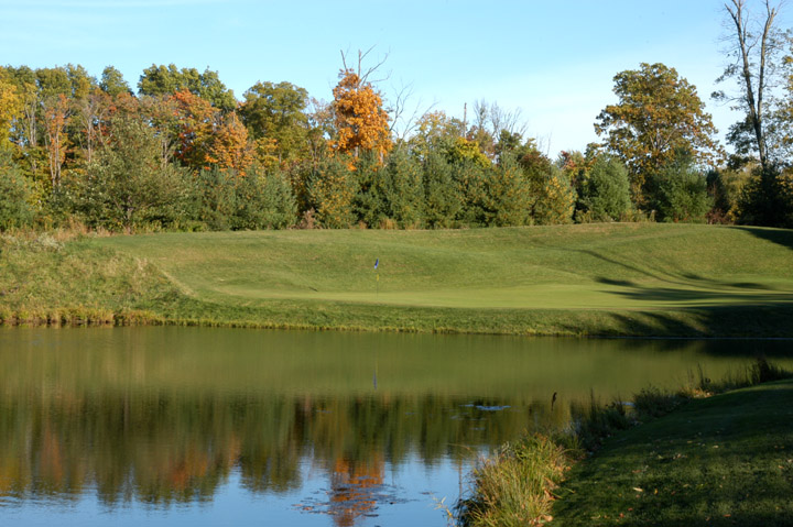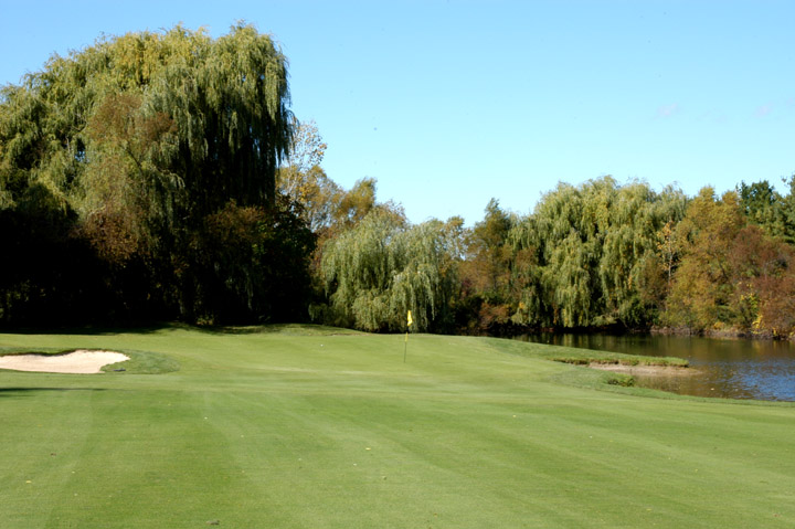 Elevated tees over water to a 35yd deep green by 44yd wide. Mound