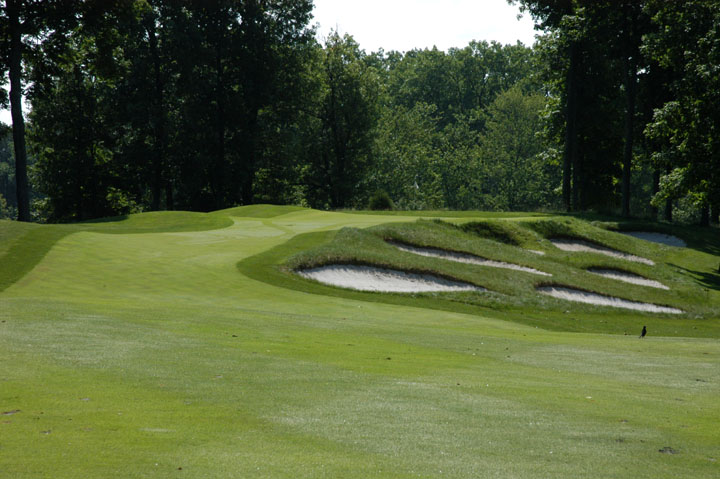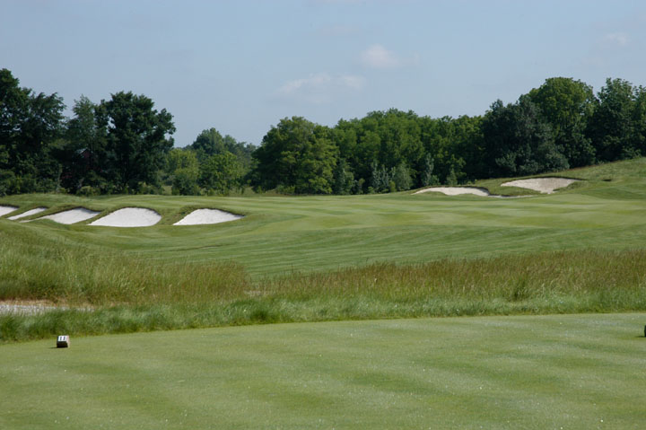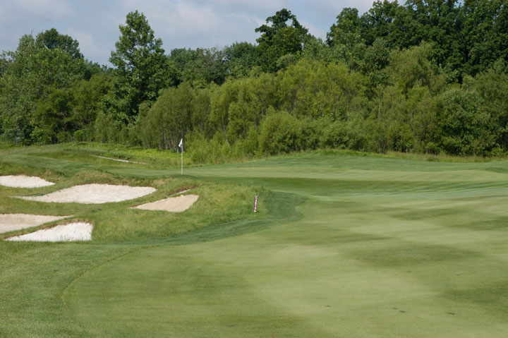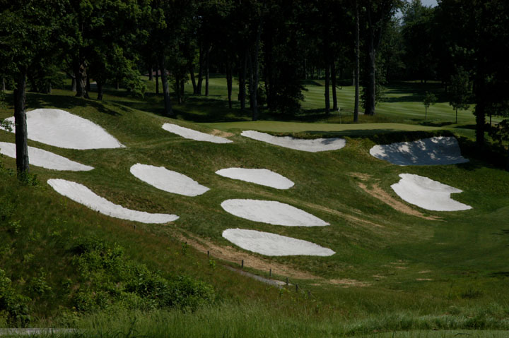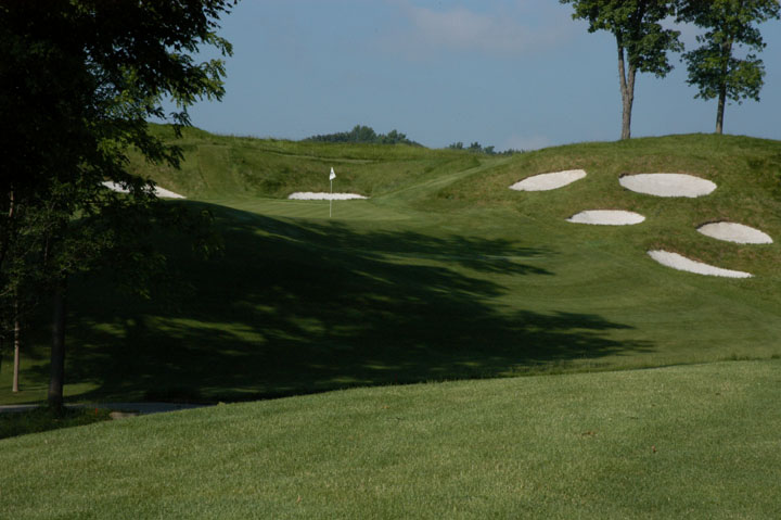 releases balls forward and left. Pot bunkers in rear are small and offer