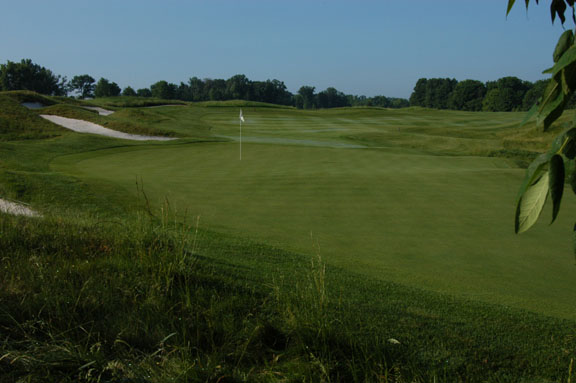 Very spacious (~30yd diameter), round green with only slight undulations.