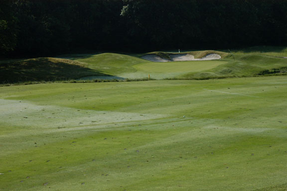 Small mounds right of the green can be used to advantage. The narrow